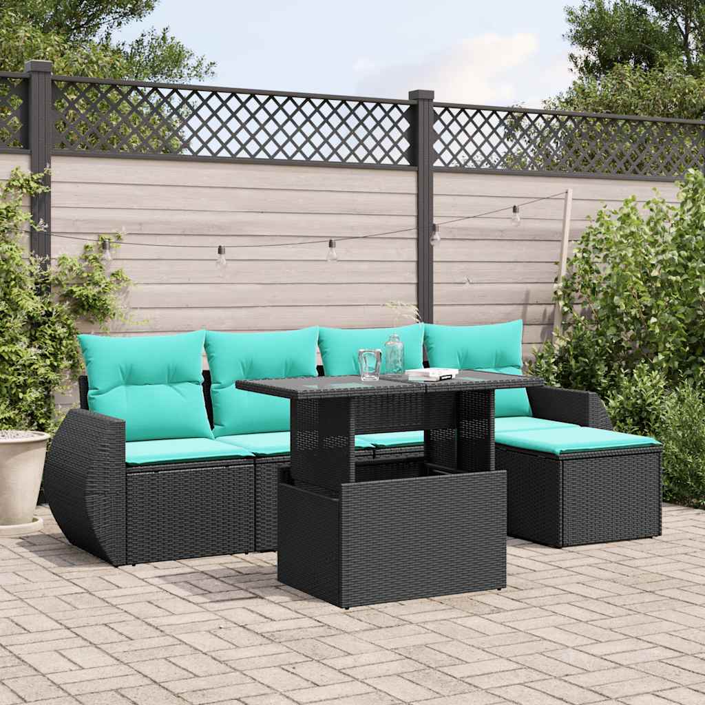 6-teiliges Gartensofa-Set mit Kissen, schwarzes Polyrattan
