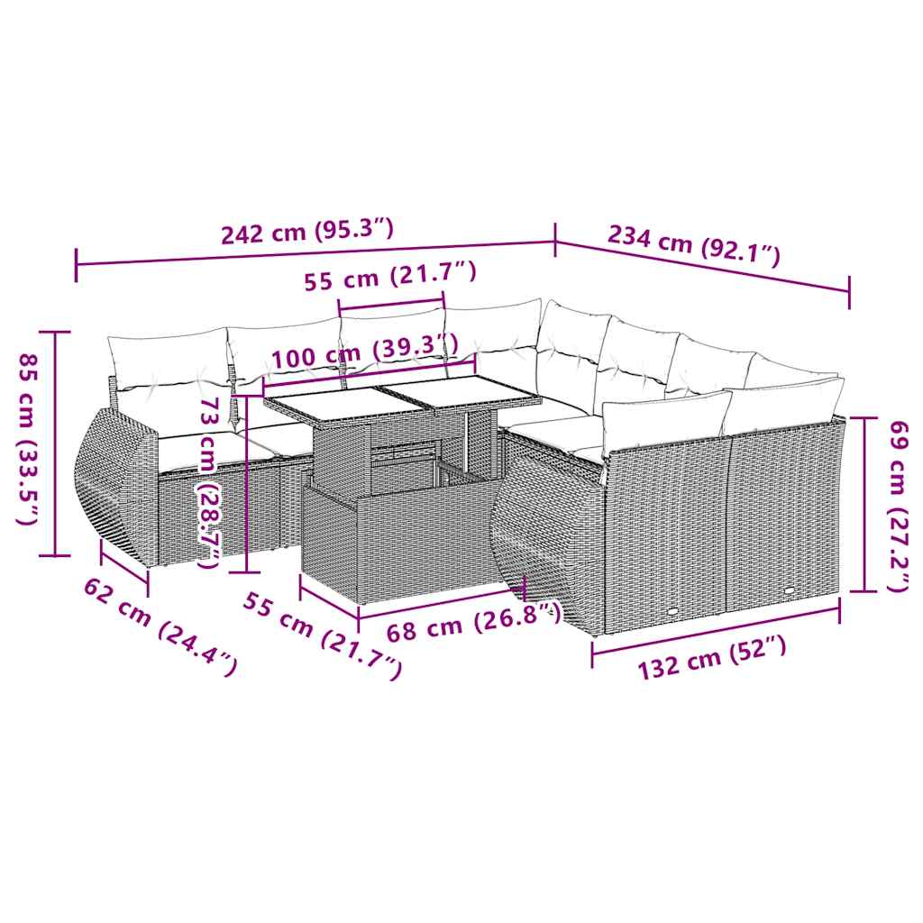 9-teiliges Gartensofa-Set mit Kissen, grau, Polyrattan